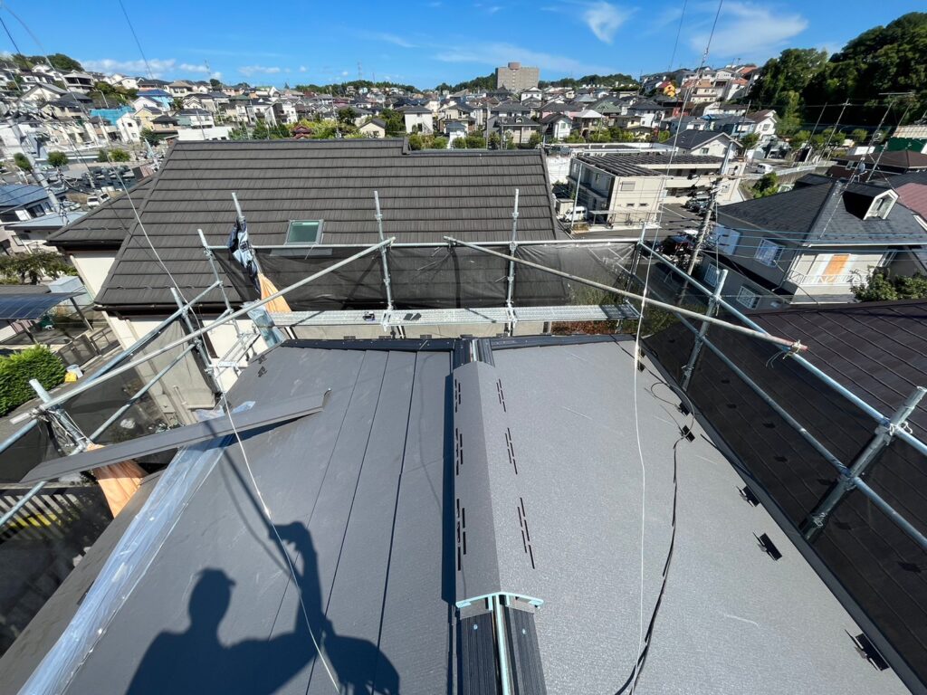 8.ケラバ板金、軒先水切りを取り付け、ガルバリウム鋼板の屋根材を施工していきます。仕上がりの色はシェイドチャコールを使用しました。